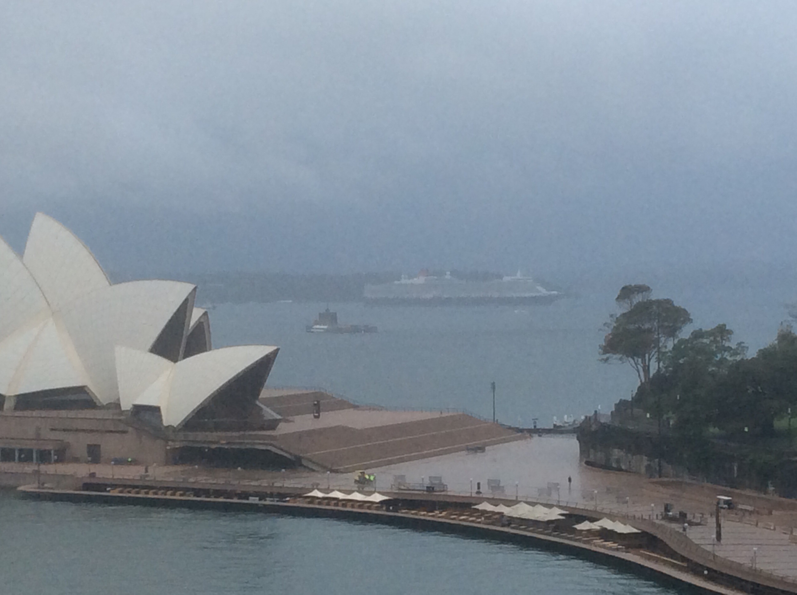 A very soggy view of the Opera House from our cabin this morning. In the distance you can just make out our sister ship Queen Elizabeth on her Round the World cruise. 🛳 🚢
