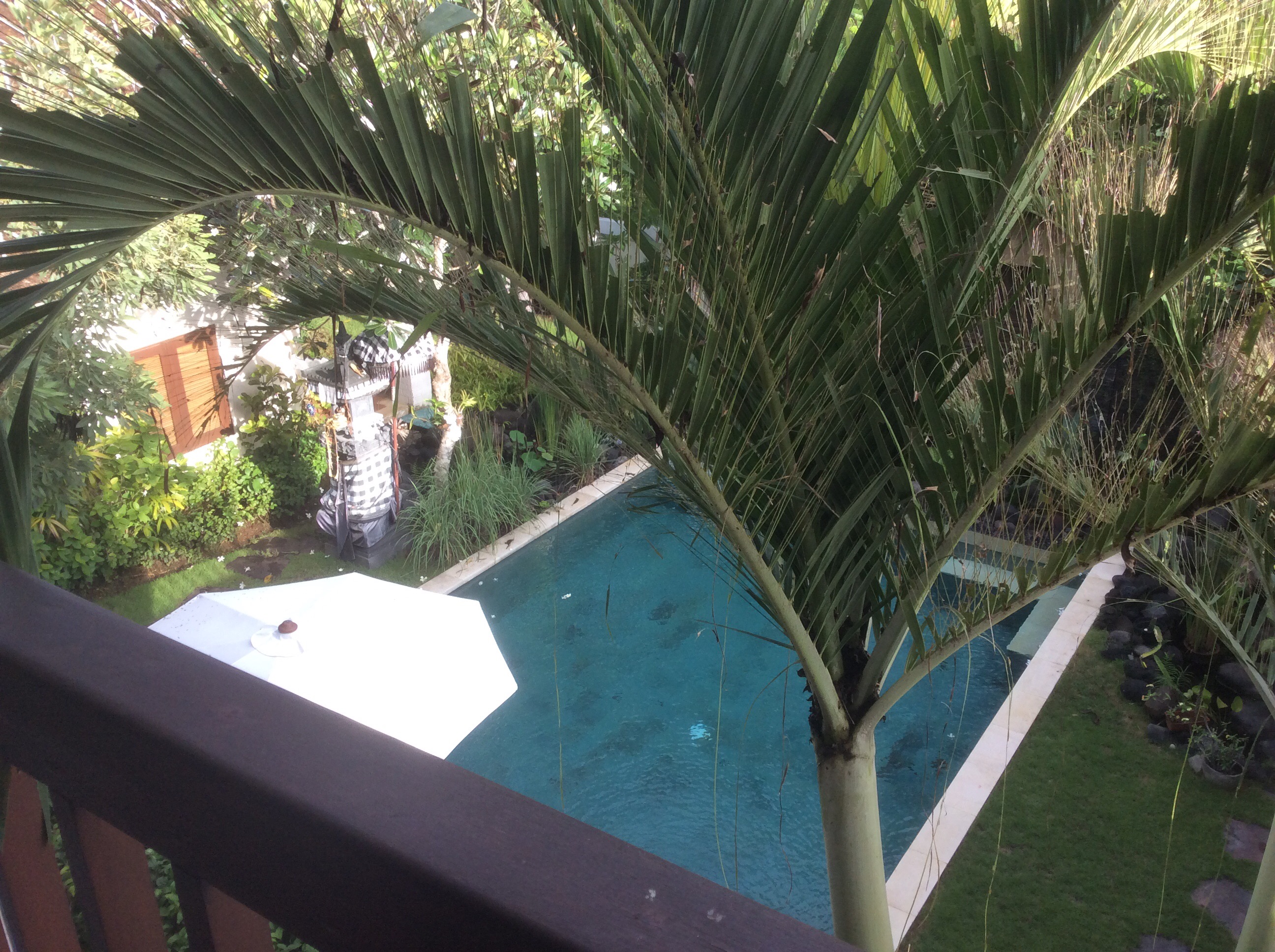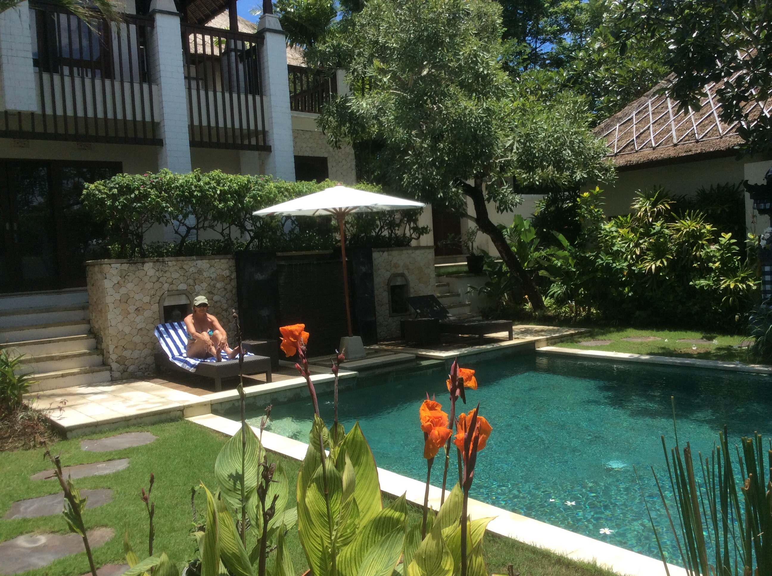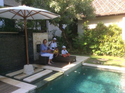Arrived in Bali by air from Singapore yesterday. As it was a very early start we didn’t do much after our arrival. Our driver (Putu) took us to the villa where we met the housekeeper (Ketut) who is his wife. Also met the compound (10 houses) manager, Buda. All very charming and welcoming. In the evening Putu collected us (we have been strongly recommended not to drive) and delivered us to a restaurant by the sea for dinner. Although we were very tired, we had a brilliant “sharing” Indonesian meal – spicy but not too spicy, lots of wonderful flavours, ginger, coriander etc.