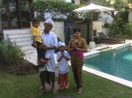 We were wakened this morning at 05.30 by singing and chanting from the temples accompanied by drums and gongs/bells as it is a special Hindu festival. At 08.00 Putu arrived with Ketut and their two children to pray and make offerings at the little shrine in the garden by the pool. They were charming in their national dress. Today we are going to Carrefour to stock up as we will not be eating out all the time.