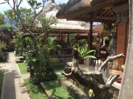 Religion in Bali: Bali is part of Indonesia which is predominantly a Muslim country. However, for historical reasons (see Google!) Bali is 92% Hindu, 6% Muslim and 2% “other”. Out of town, where there is more room, every house has its own Hindu temple in the garden. In town, where space is limited every house has its own little shrine (see picture) and almost daily, offerings and prayers are made. A very interesting phenomenon occurs in the street where we are living: there is one section for religions — a Hindu temple is next to a mosque, next to a Buddhist pagoda, next to a Roman Catholic church next to a Presbyterian church ! And, they all share a car park. It’s a one stop shop for religion, a bit like Hatton Garden (jewelry) , Saville Row (tailors) , Harley Street (doctors). It is a model of tolerance between the different faiths.